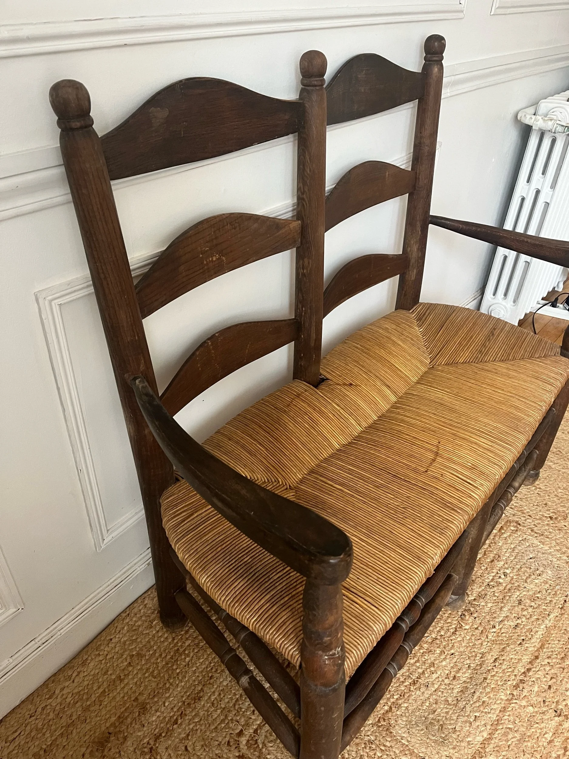 Banquette radassier en bois et paille ancienne et rustique en bon état, et nous fait penser au travail de Charles Dudouyt.