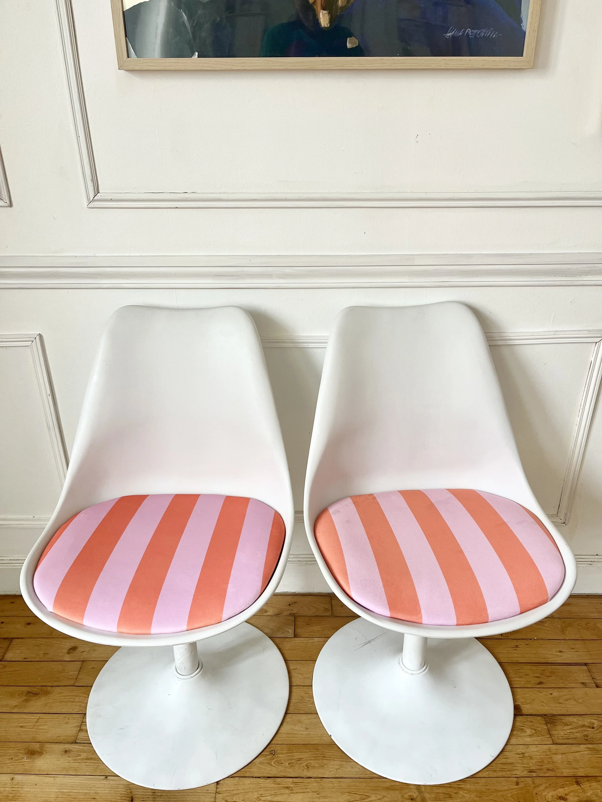 Chaise vintage pivotante avec la coque en plastique, assise coussin en velours rayé rose et orange.