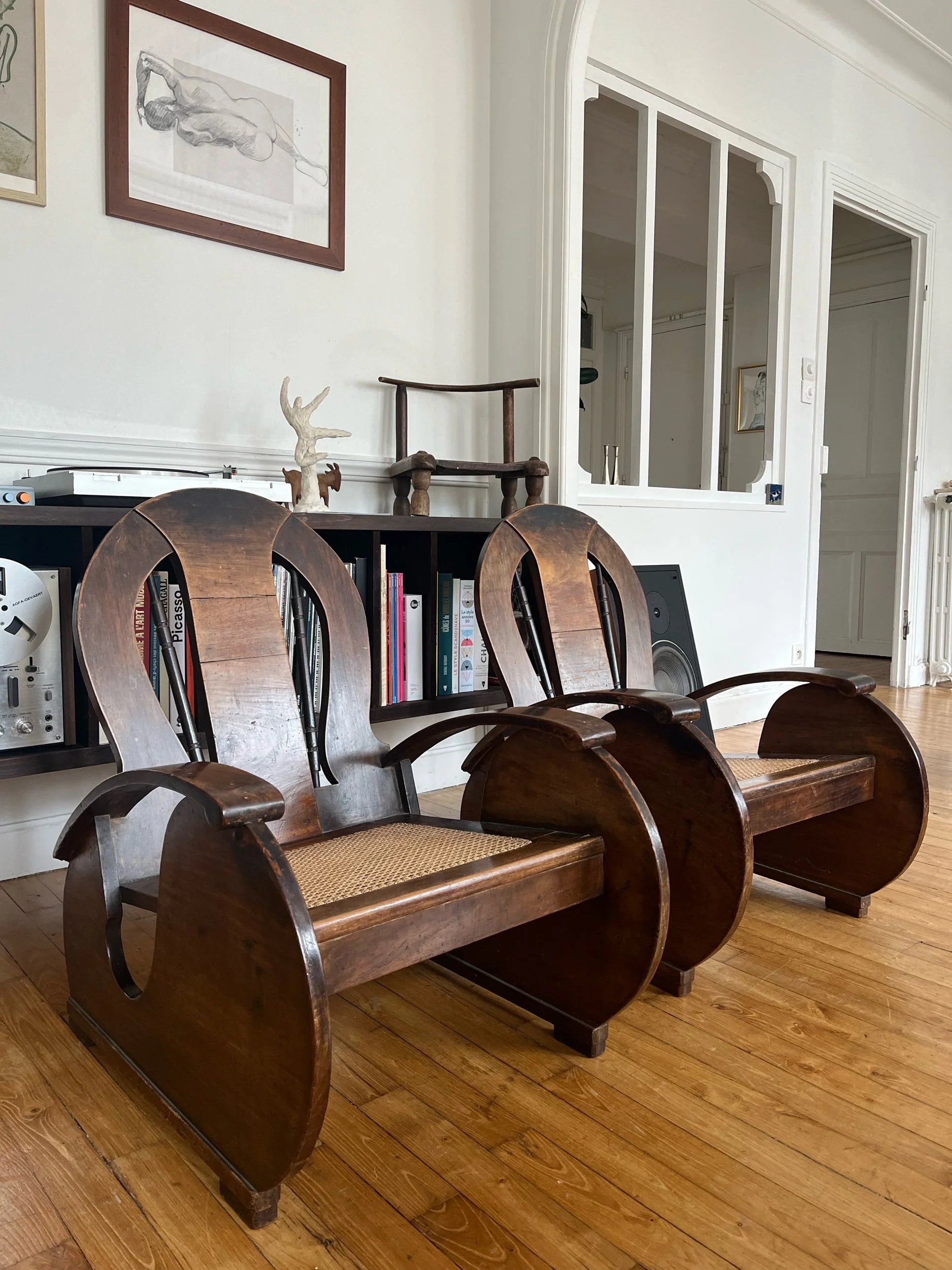 Fauteuils Art déco en bois assise en cannage de rotin artisanal, époque coloniale 1930 en provenance des Philippines,
