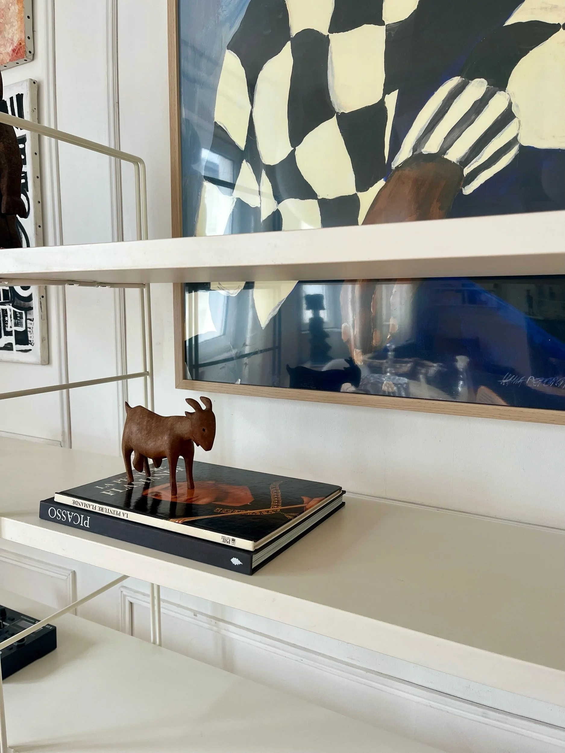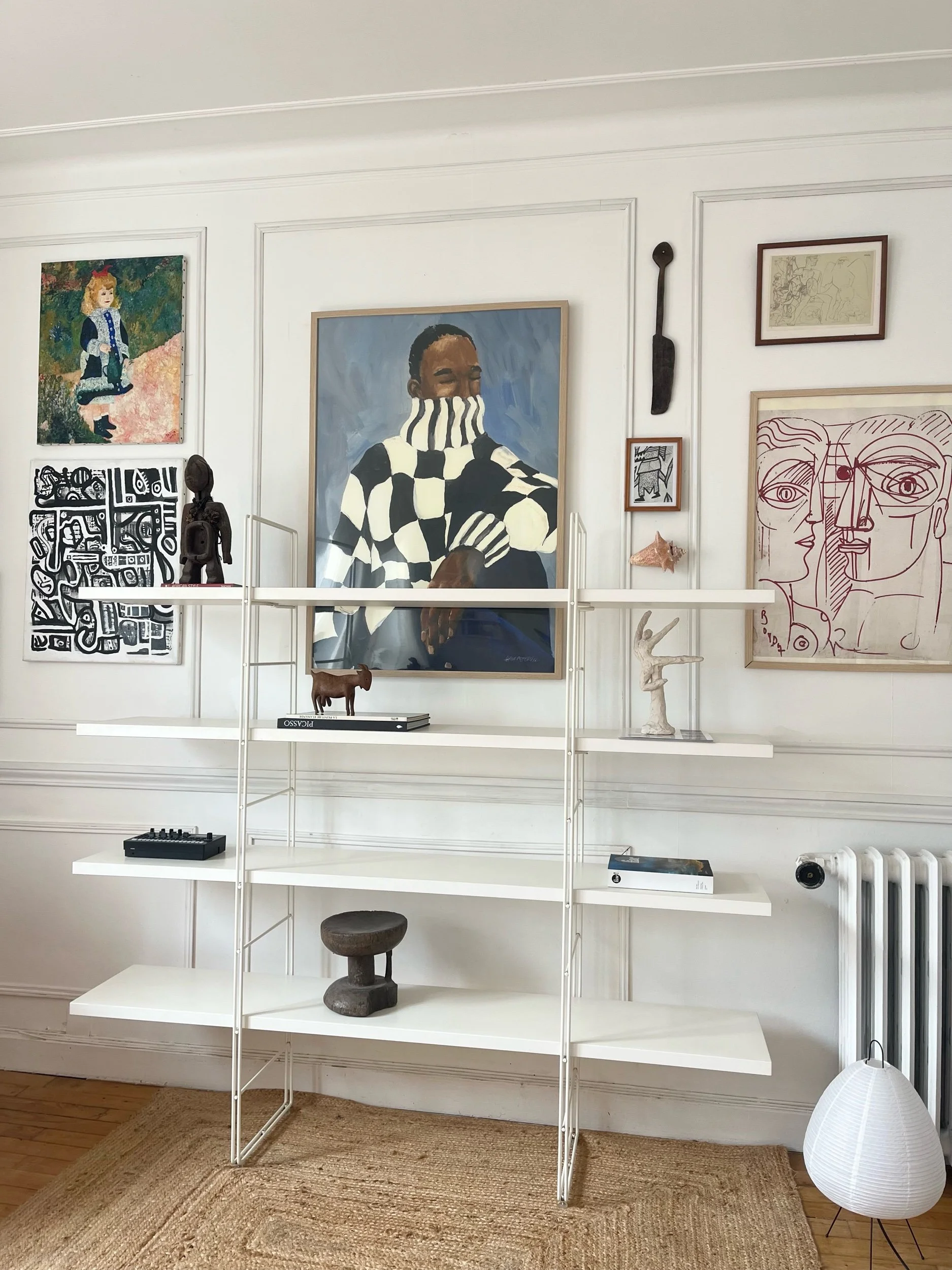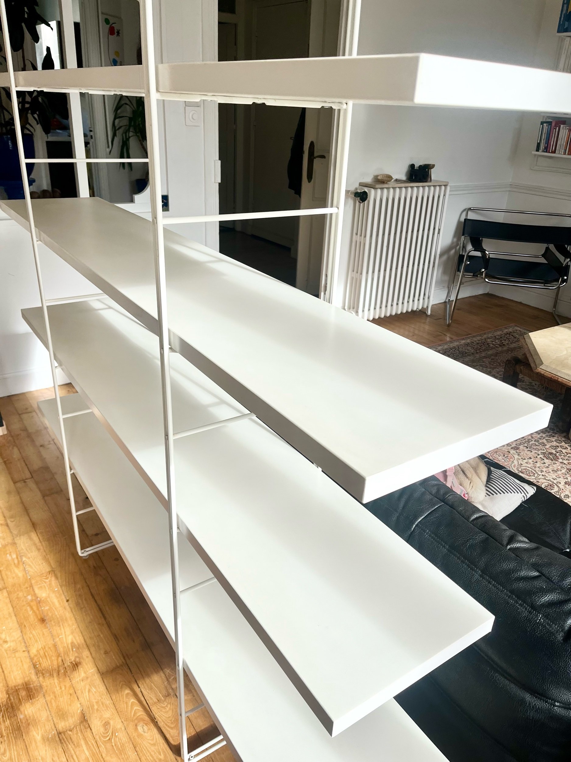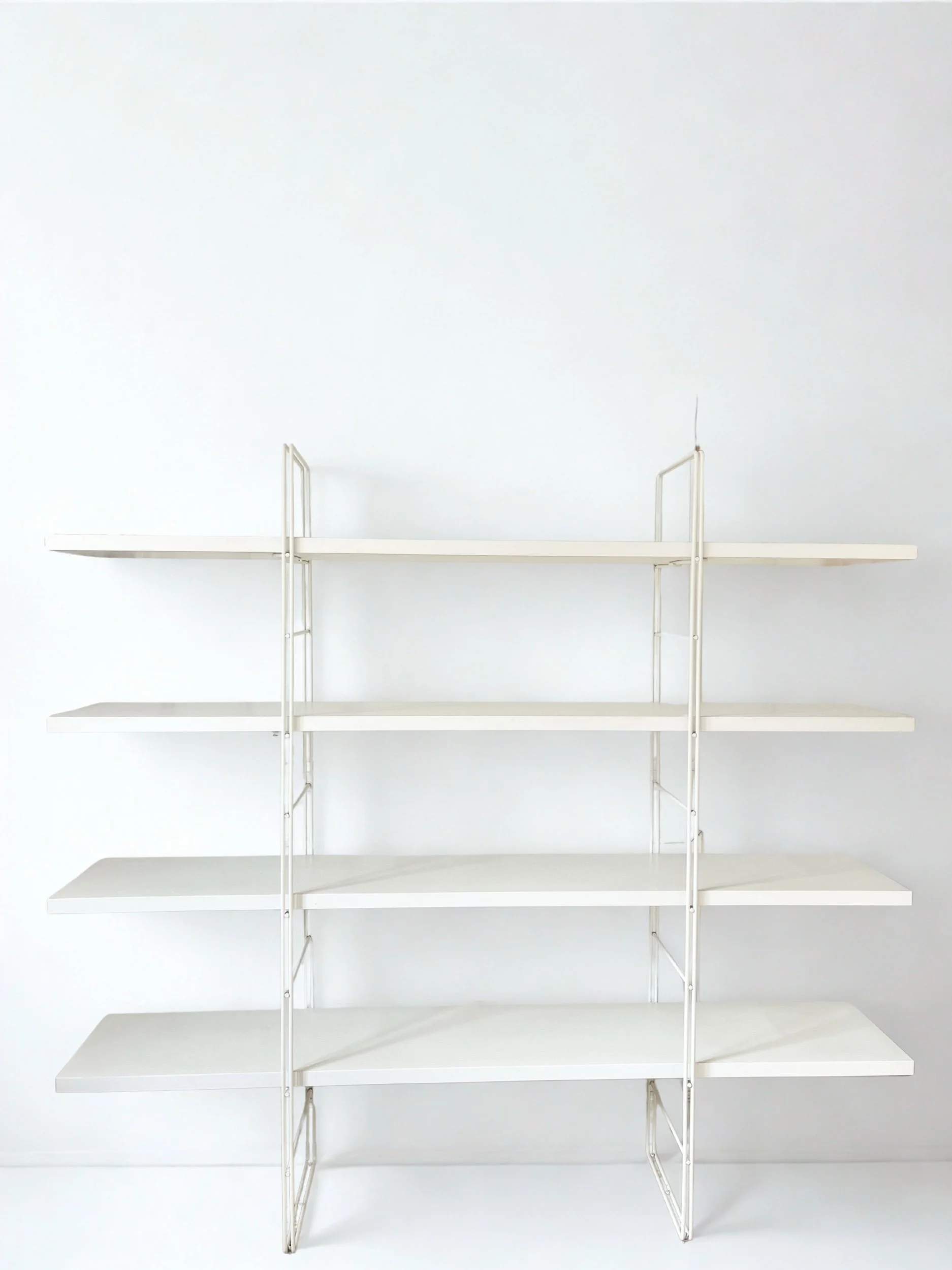 Structure en métal laqué blanc formant deux montants graphiques, accueillant quatre longues tablettes blanches aux lignes fines et élégantes.