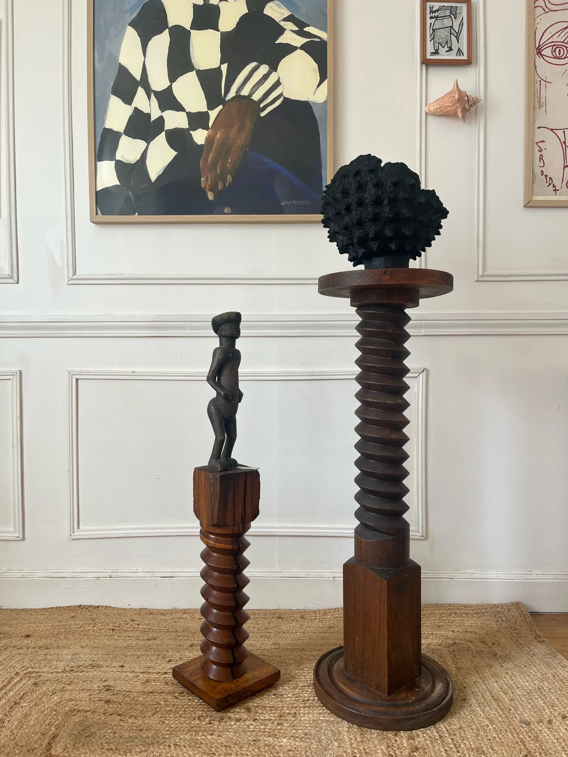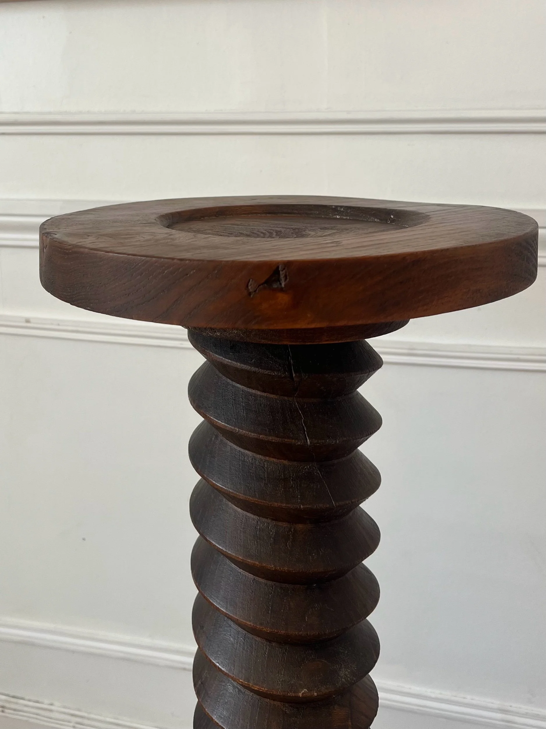 La vis en chêne, taillée à la main, forme un fût fileté d'une belle régularité — ses anneaux successifs créent un jeu d'ombres et de lumières qui lui donne une vraie présence sculpturale.