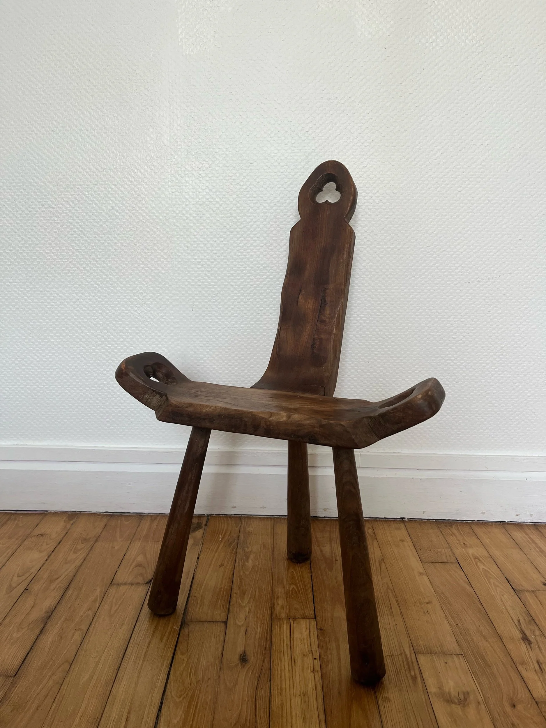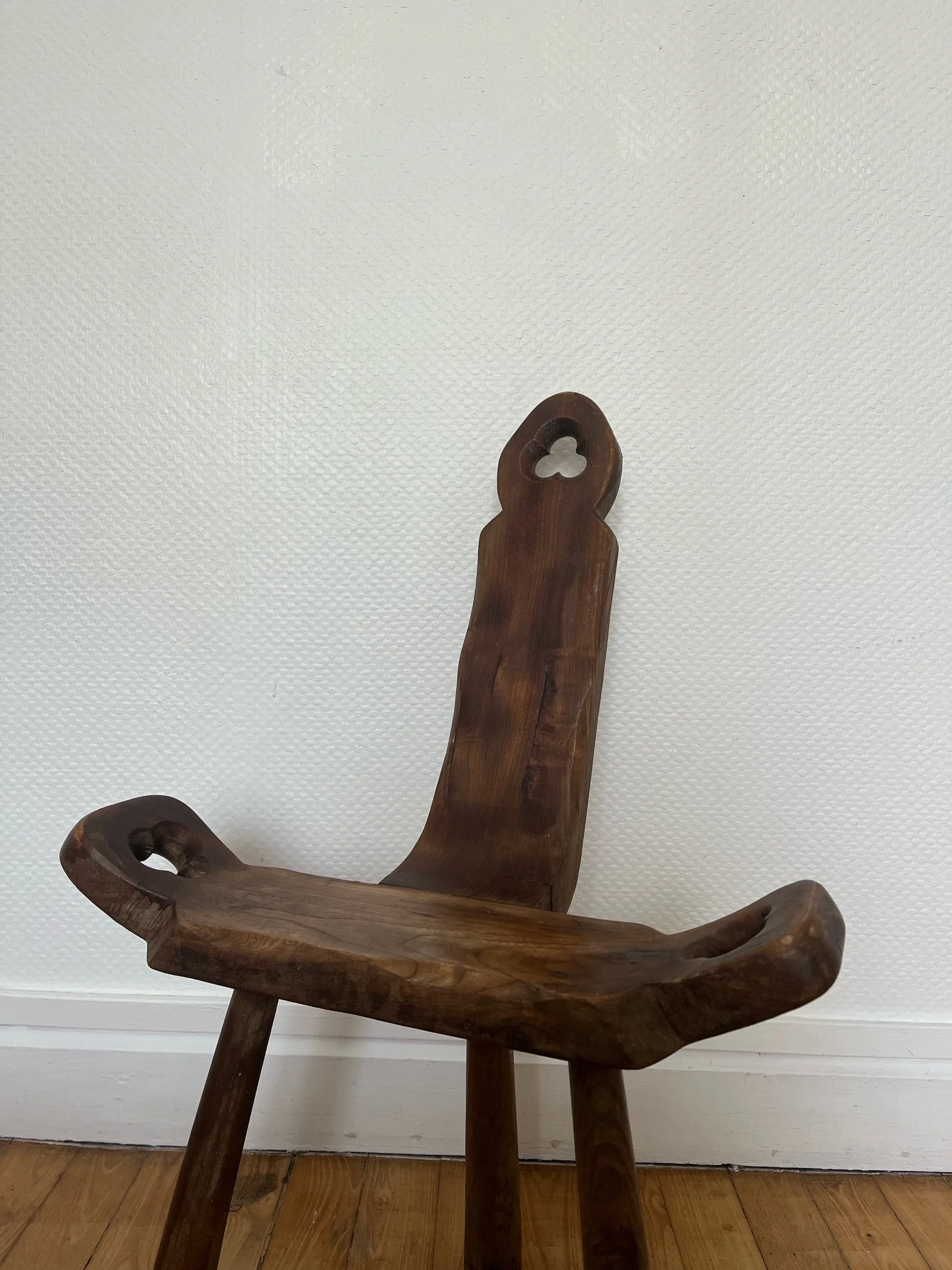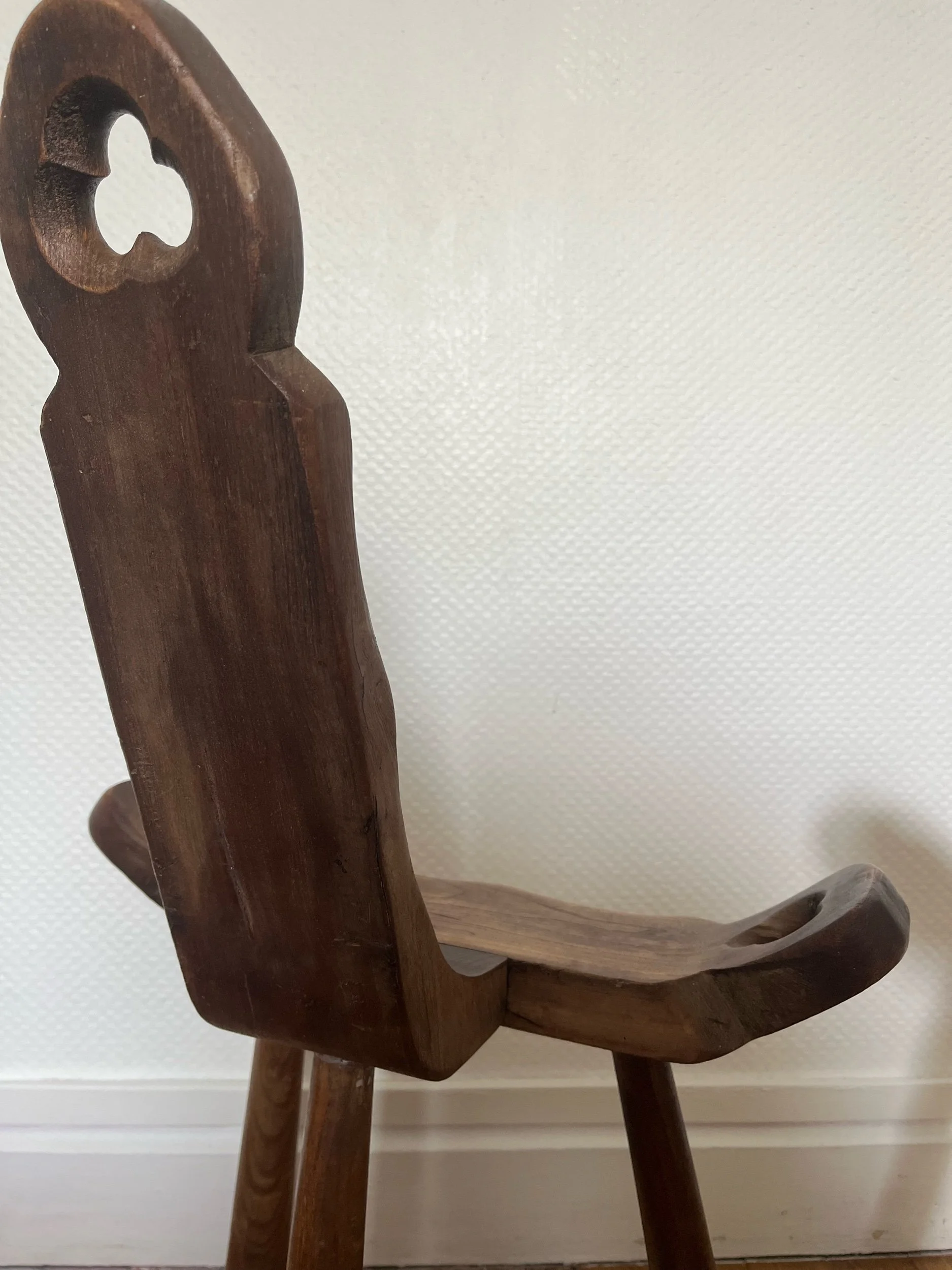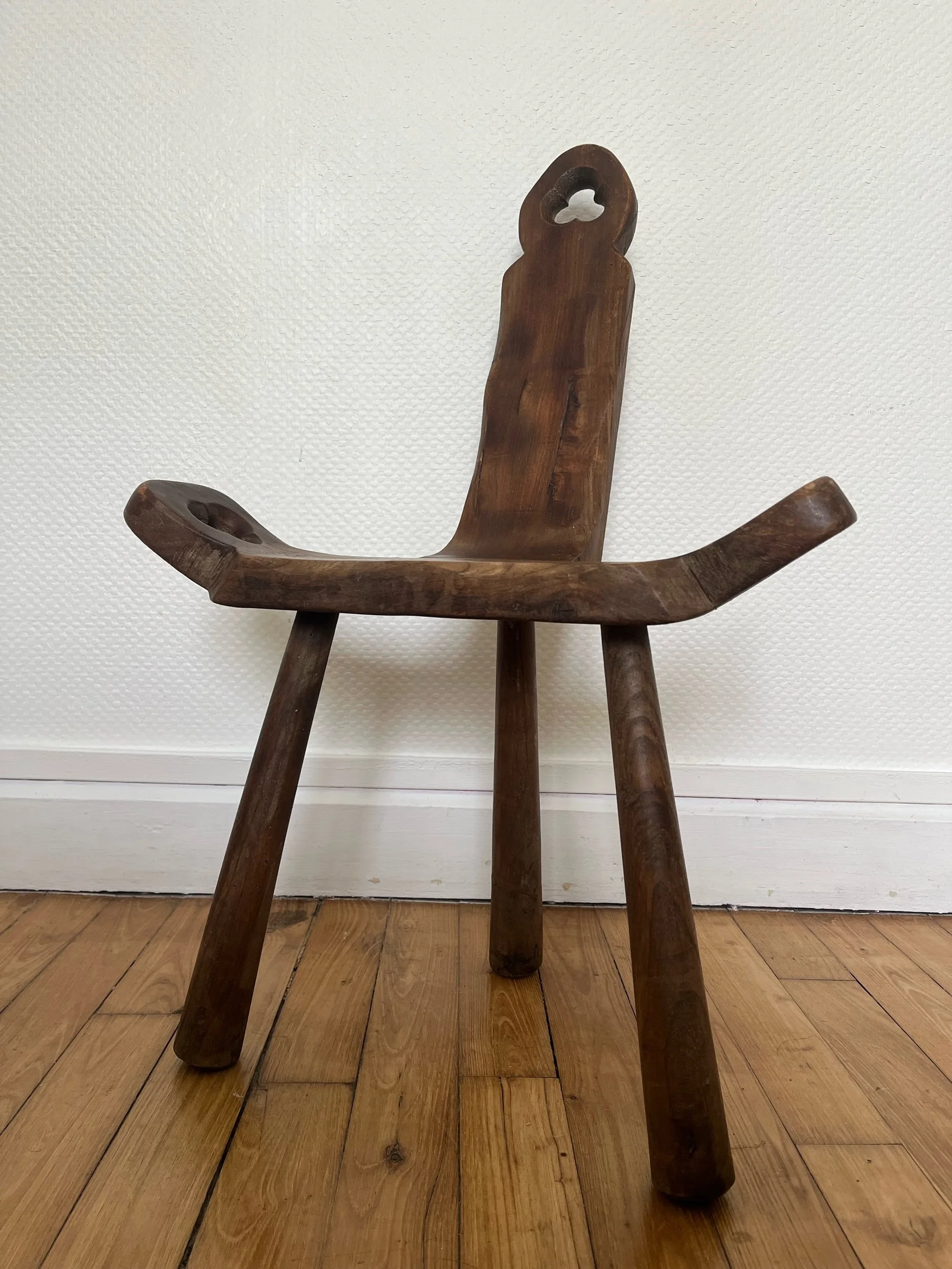Chaise tripode en bois primitive. Un bel objet brutaliste à la patine distinctive.